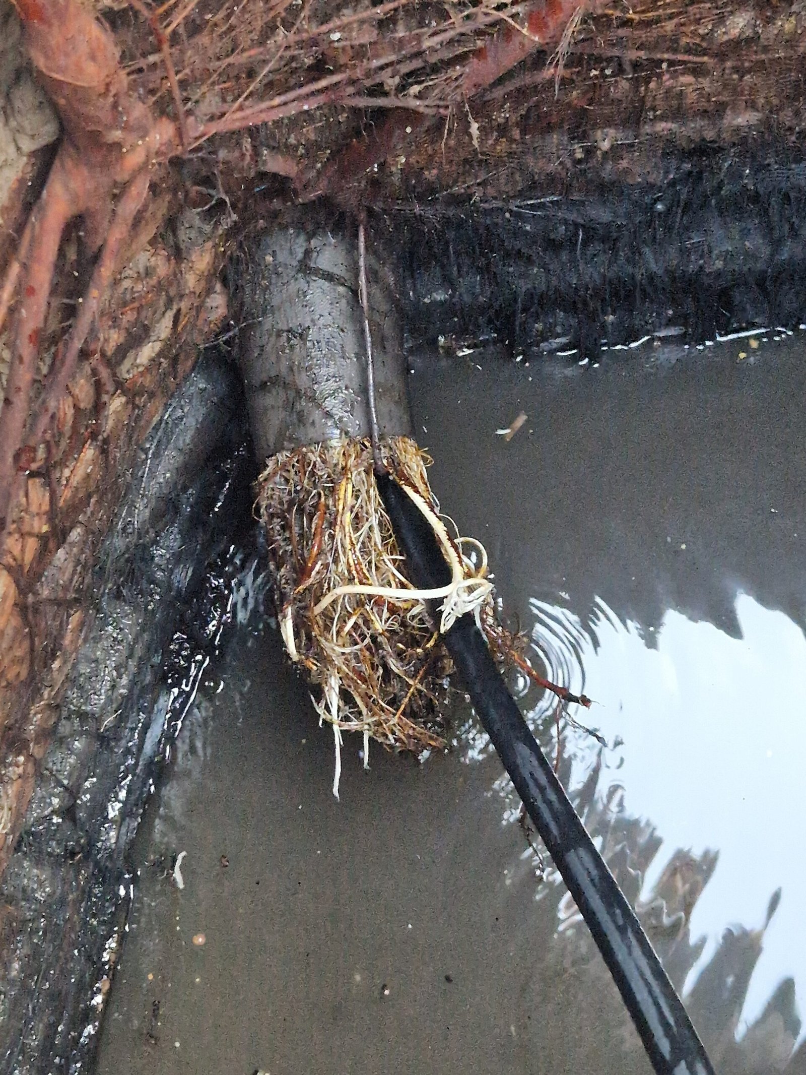 Posle velikog broja godina i često decenija, korenje nalazi put do kanalizacije. Vlaga privlači korenje da uđe u cev i na taj način polako, ali sigurno, delimično, ili potpuno se cev zapušava.
